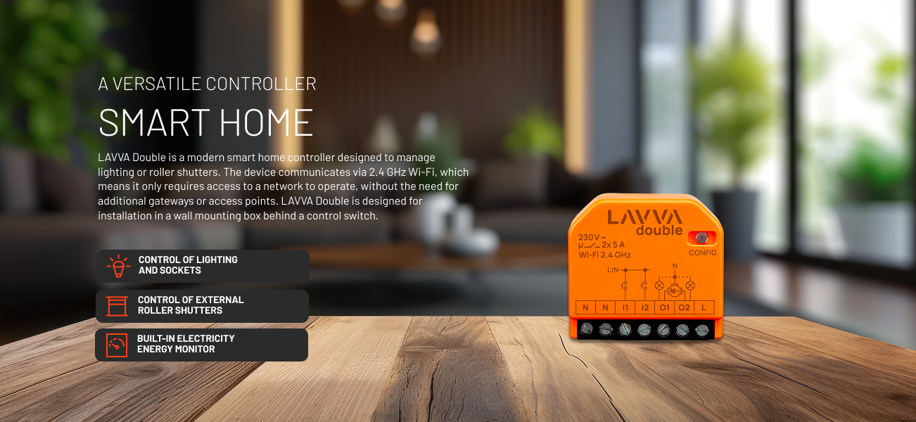 The newest generation of 2-channel devices is an innovative solution that enables intelligent management of roller blinds, lighting circuits and electrical sockets. A compact housing, easy installation, automatic calibration and control via the LAVVA mobile app are just some of the advantages of this device. With it, You can enjoy comfort, save energy and have full control over Your home.